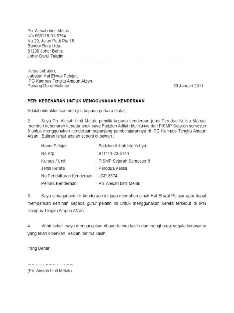 Contoh Surat Memberi Kebenaran Menggunakan Kenderaan