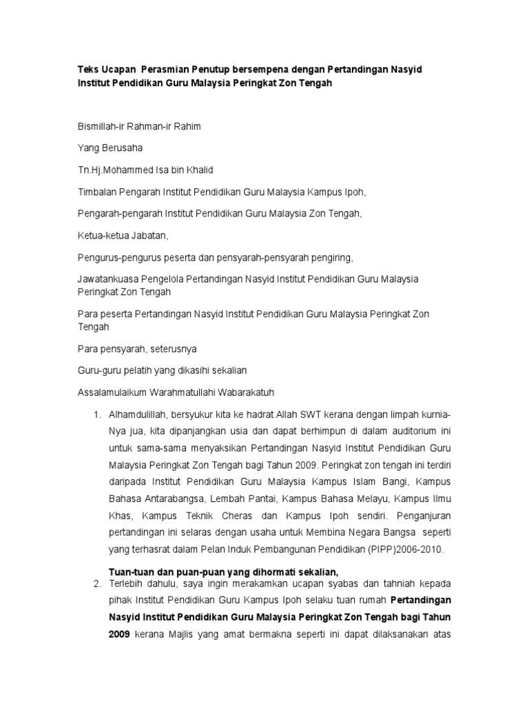 Teks Ucapan Perasmian Penutup
