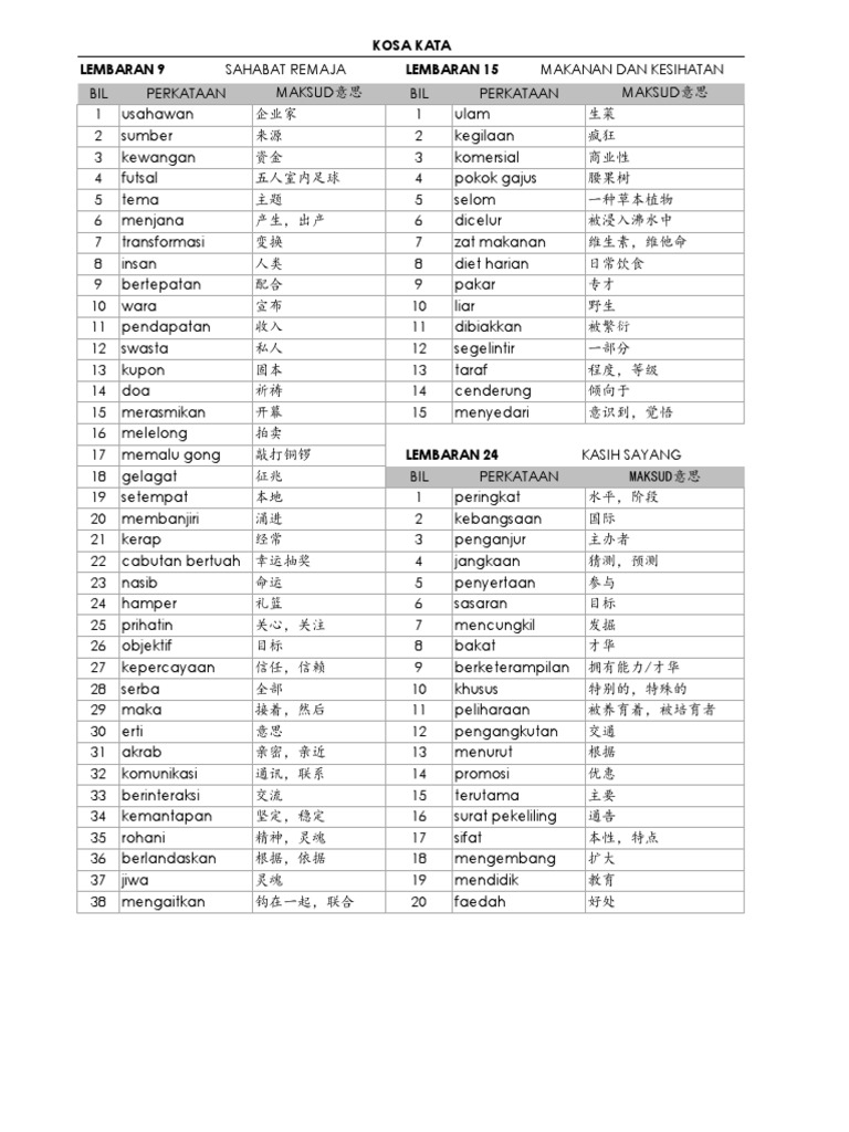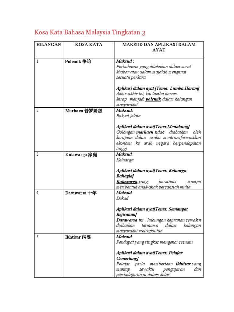 Kosa Kata Bahasa Malaysia Tingkatan 3